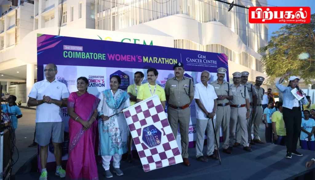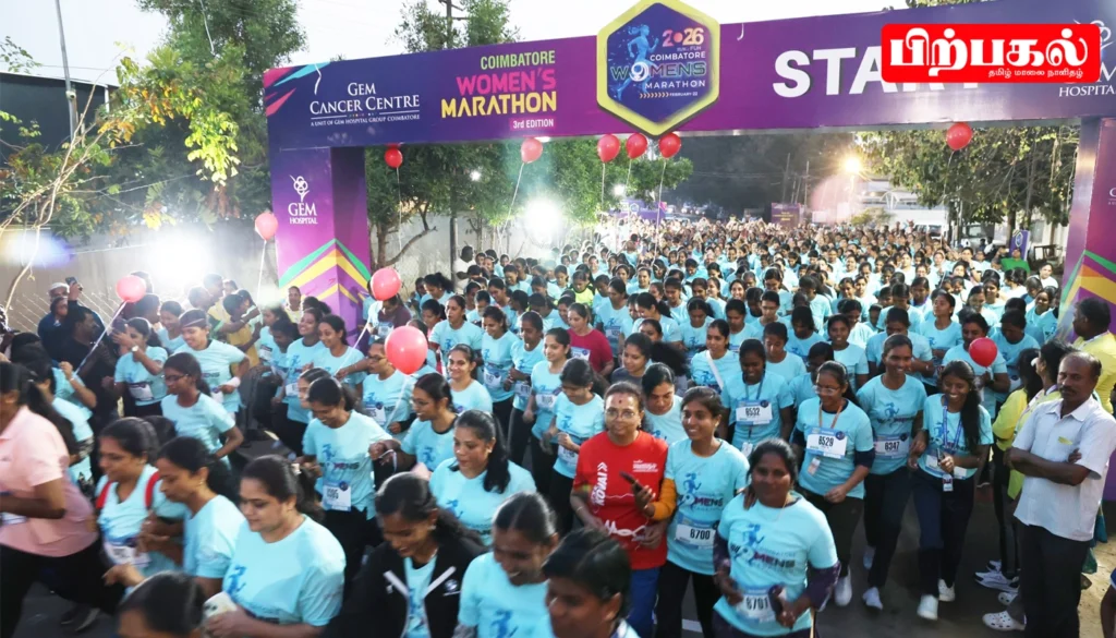 கோவை ஜெம் கேன்சர் சென்டர் மற்றும் ஜெம் அறக்கட்டளை இணைந்து, புற்றுநோய் விழிப்புணர்வு மற்றும் பெண்களின் பாதுகாப்பை வலியுறுத்தி நடத்திய ‘கோவை மகளிர் மாரத்தான் 2026’ போட்டி நடைபெற்றது.